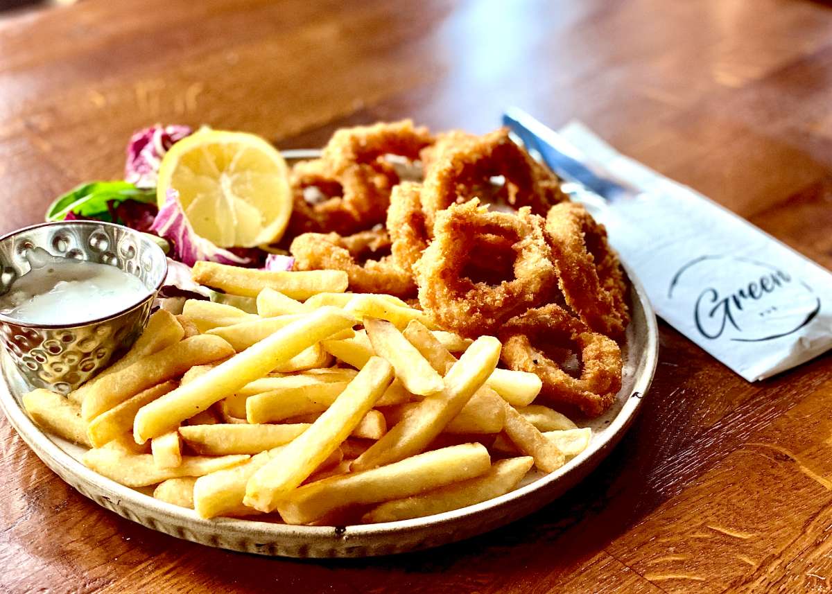 Calamari in panco, cartofi prajiti si sos tzatztki